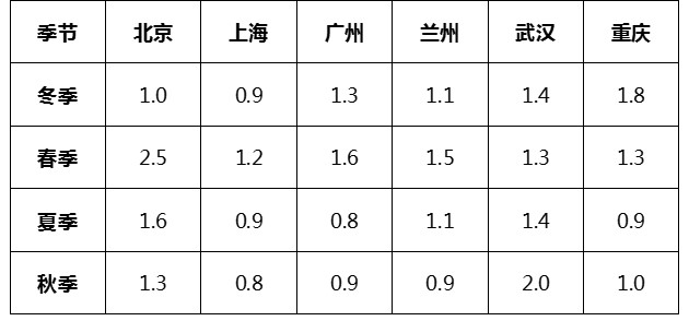 表格1. 六地四季手工數(shù)據(jù)標(biāo)準(zhǔn)偏差均值(單位:μg/m3)
